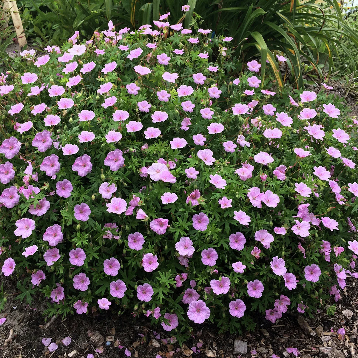 Großblumig, zartrosa, filigran und fein geädert steckt in diesem Storchschnabel eine wüchsige, robuste und ausbreitungsfreudige Staude mit kissenartigem Wuchs. In Kübeln, als Beeteinfassung oder im Vordergrund jeden Staudenbeetes erobert Striatum nicht nur die Herzen fleißiger Bienchen. Schneckenfest und robust. Freuen können Sie sich auch auf die zu erwartende blutrote Herbstlaubfärbung.