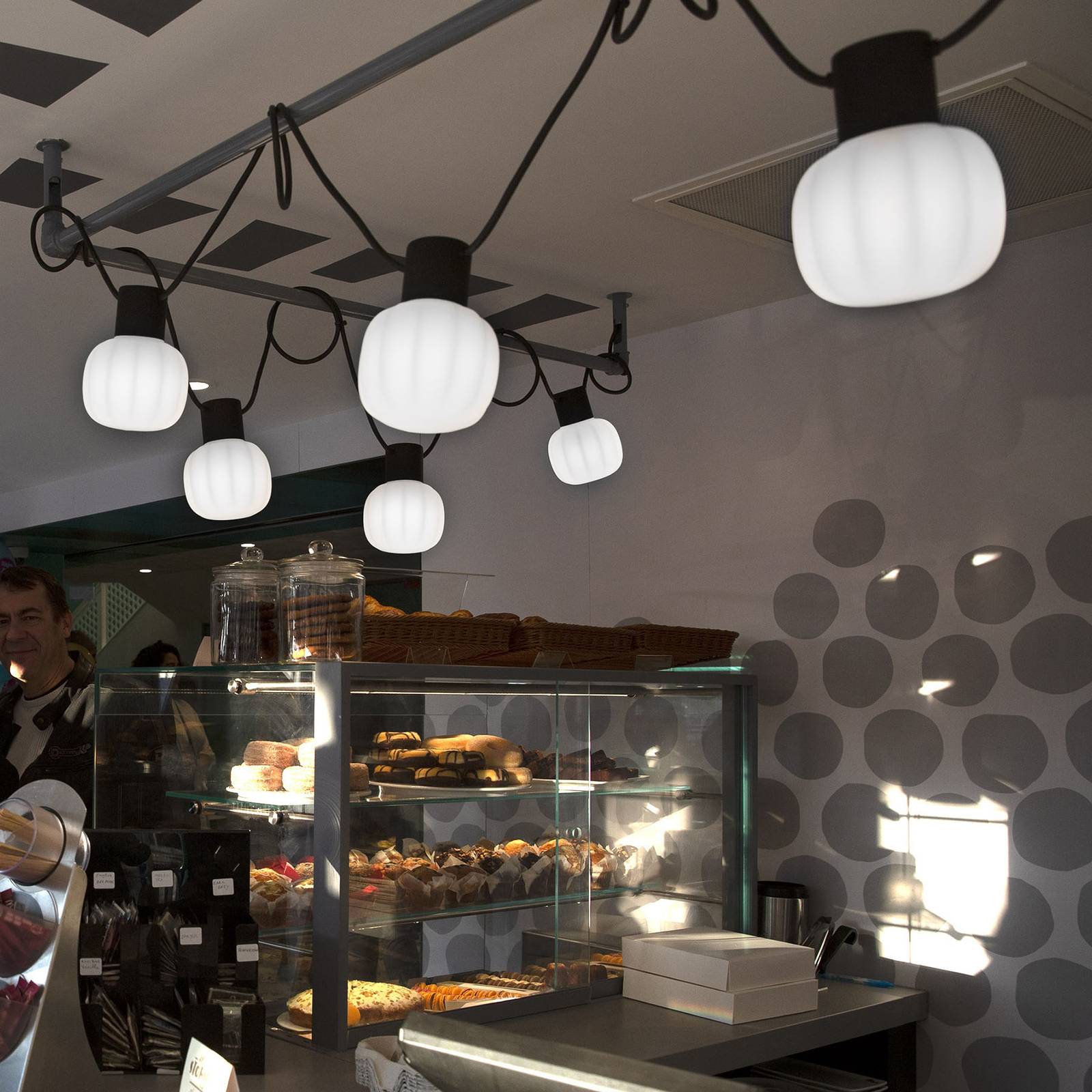 Schwarze Außen-Lichterkette Kiki mit zehn weißen Lampionschirmen Die Lichterkette Kiki ist eine moderne Option zur Dekoration von Pergolen, Terrassen, Pavillons oder Bäumen. Ihre zehn Schirme sind aus opalem Polyethylen gefertigt und nehmen je eine E27-LED-Lampe auf. Die zylindrischen Halterungen aus Gießharz, an denen die Schirme angebracht sind, dienen zur Einführung des Kabels. Letzteres kann zur Befestigung der Lichterkette über andere Objekte geschwungen werden und bietet an den Endpunkten je einen Haken zu Arretierung. Das Konzept der Lichterkette wurde 2018 von der renommierten italienischen Designerin Paola Navone entworfen. Für die Fertigung zeichnet der Hersteller Martinelli Luce verantwortlich. – mit IP44-Außenstecker ausgestattet – ausgezeichnet mit dem iF Design Award 2019